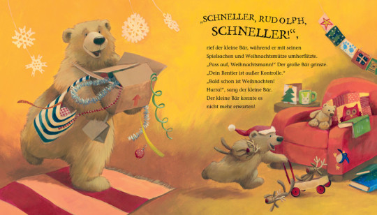 Der kleine Bär flitzt mit Weihnachtsmütze und seinen Spielsachen umher. Er ist der Weihnachtsmann und saust mit seinen Schlitten samt den Rentieren durch die Wohnung. Er ist so aufgeregt. Bald ist Weihnachten und der kleine Bär freut sich schon sehr darauf. Er kann es kaum erwarten. Aber wie lange dauert es denn eigentlich noch? Der kleine Bär fragt immer wieder, ob denn nun Weihnachten ist. Bald – antwortet ihm darauf der große Bär. Aber vorher haben sie noch eine Menge zu tun: Plätzchen backen, Geschenke einpacken und einen Weihnachtsbaum finden. Der kleine Bär möchte unbedingt helfen.